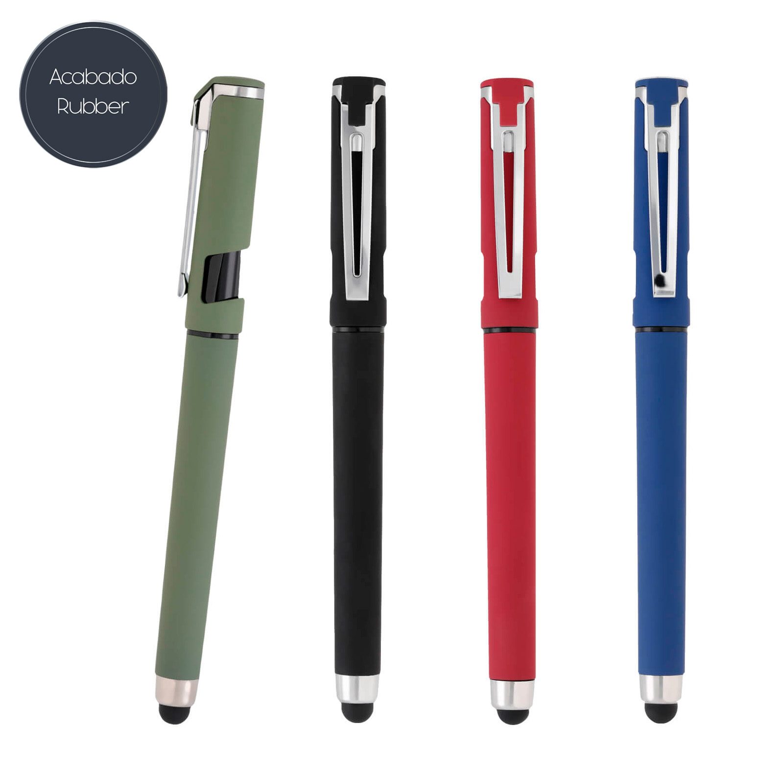 Bolígrafo de plástico acabado rubber; tinta de gel y goma touchs creen. Incluye tapa con clip y espacio que sirve como soporte para celular.