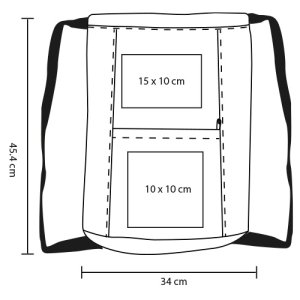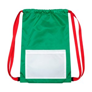 Morral tricolor de poliéster con correas ajustables y bolsa frontal con cierre.