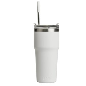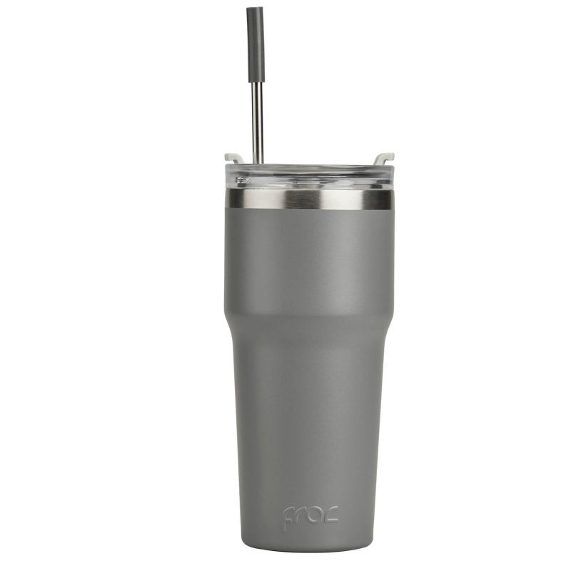 Termo con doble pared de acero inoxidable insulado al vacio con acabado rugoso base antiderrapante tapa de rosca con silicón y popote metálico. (Incluye limpiador para el popote).