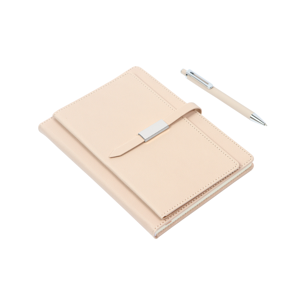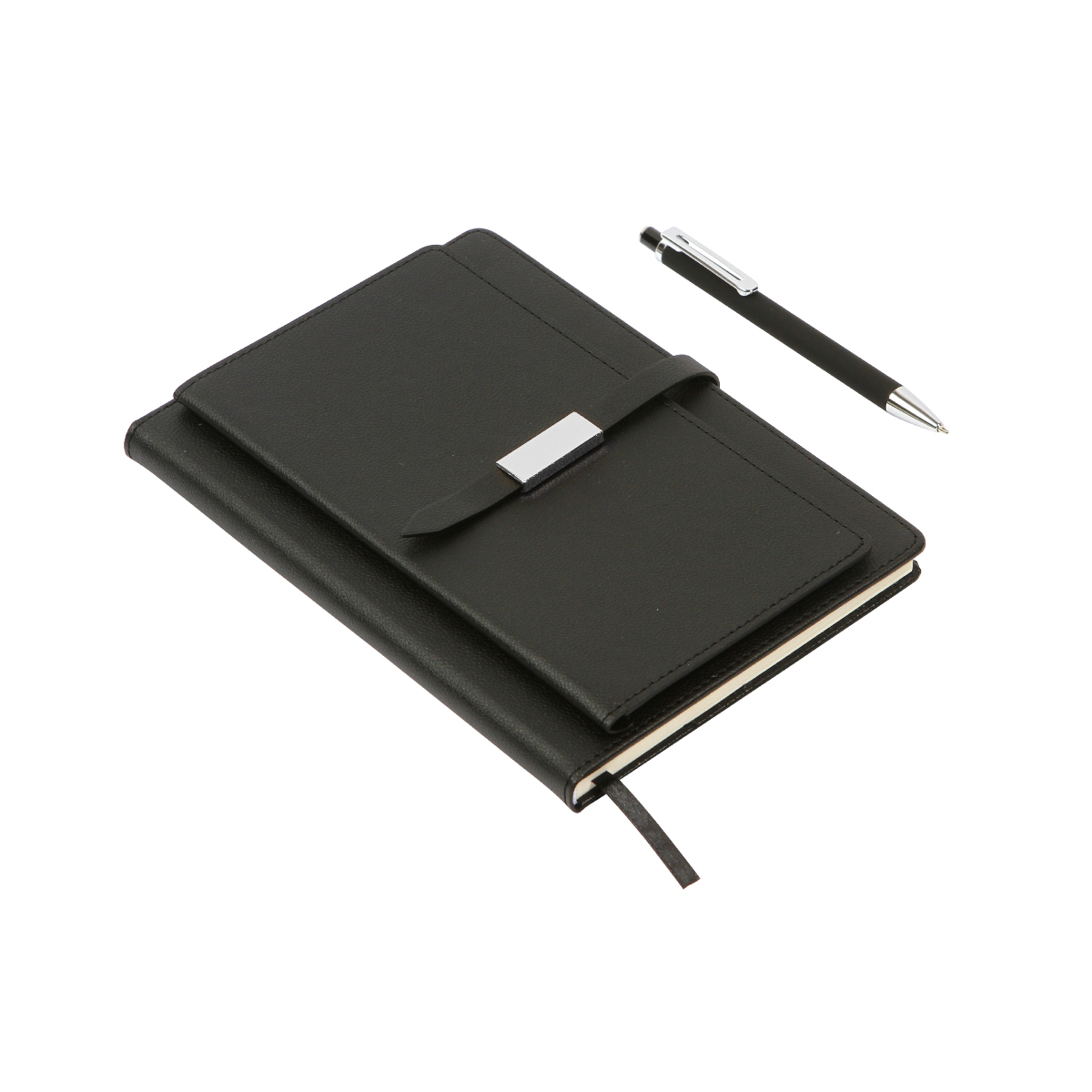 Libreta con cubierta de pasta dura cubierta en curpiel, 80 hojas rayadas de 80 g., listón separador de 6 mm y detalles metálicos en color plateado. Incluye un bolígrafo con cuerpo fabricado en aluminio de acción de botón, tinta azul. Elegancia y funcionalidad para el día a día.